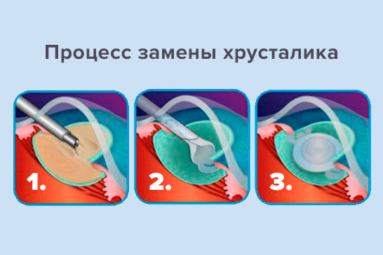 Естественный хрусталик размягчается ультразвуком и превращается в эмульсию, а затем выводится из глаза через микродоступ в роговице