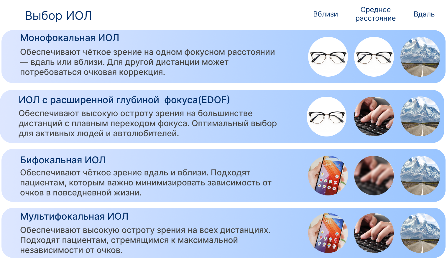 | Монофокальные | Чёткое зрение на одном расстоянии (даль или близь). Для второй дистанции могут потребоваться очки. | Гидрофобный / гидрофильный акрил | Сферические / асферические | Alcon, Johnson & Johnson, Bausch + Lomb, Zeiss, Rumex, Care Group, HumanOptic |