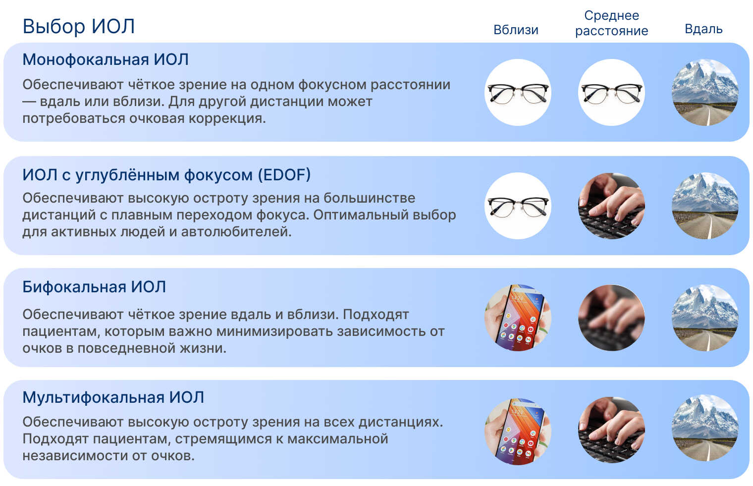 | Вид ИОЛ | Назначение / Особенности зрения | Тип материала | Тип оптики | Производитель |